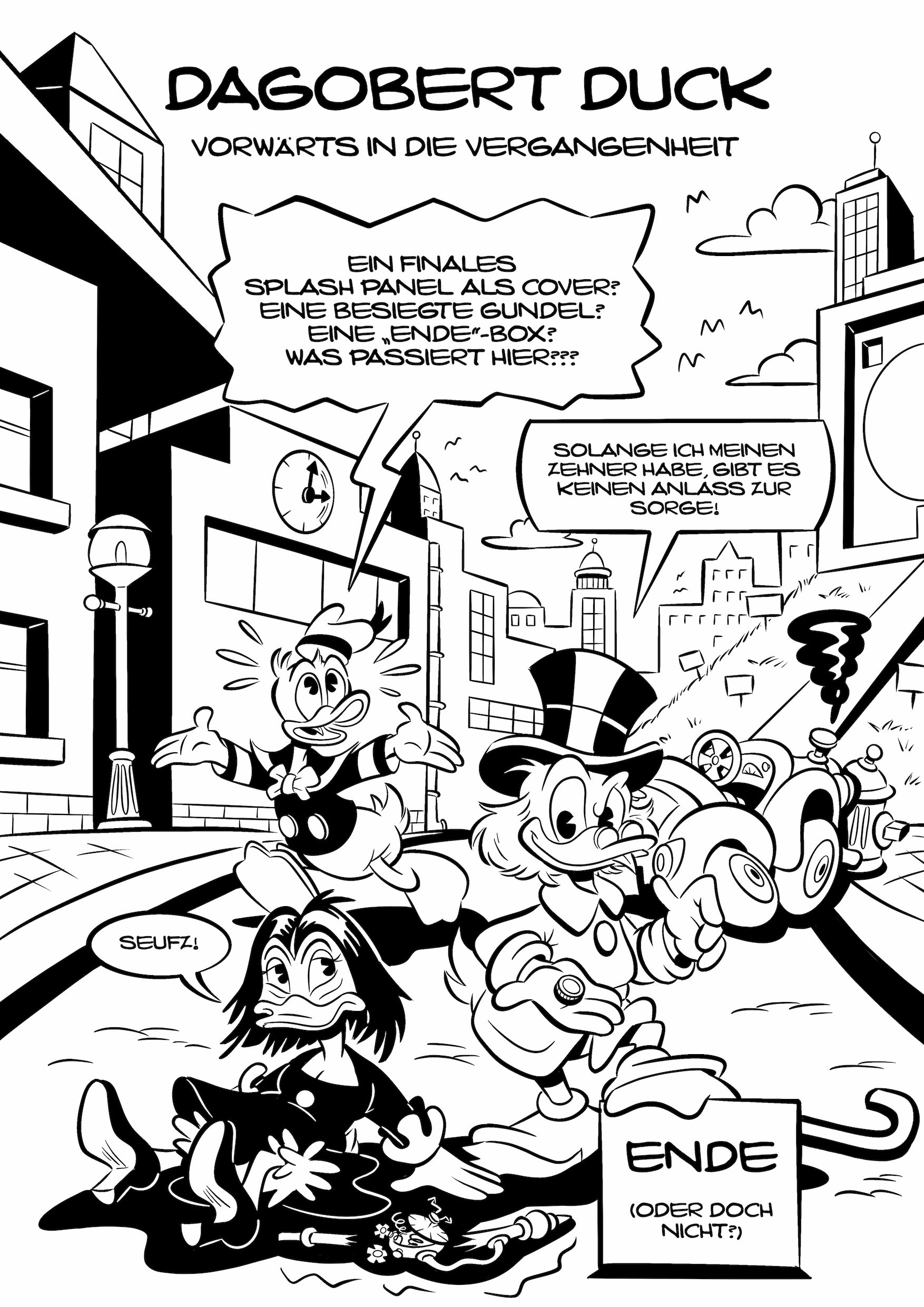 Hintergrund: Die nächste von Don Rosa inspirierte Geschichte (Gähn). Die besten Gag-Storys von Don Rosa sind die beiden Gundel-Geschichten. Donald und Dagobert werden eingeschränkt durch einen Zauber und müssen Gundel durch ganz Entenhausen verfolgen. Ich ergänze es zur Trilogie, dieses Mal sorgt der Zauber für eine rückwärts erzählte Geschichte. Wie das funktioniert? Lasst euch überraschen! Die Idee basiert auf einer rückwärts erzählten Simpsons-Geschichte (Die Reise zum Mittelpunkt des Kwik-E-Marktes), die wahrscheinlich von anderen rückwärts erzählten Geschichten inspiriert wurde (z.B. die Seinfeld Folge „Der Verrat“, die wiederum auf dem Theaterstück von Harold Pinter beruht).