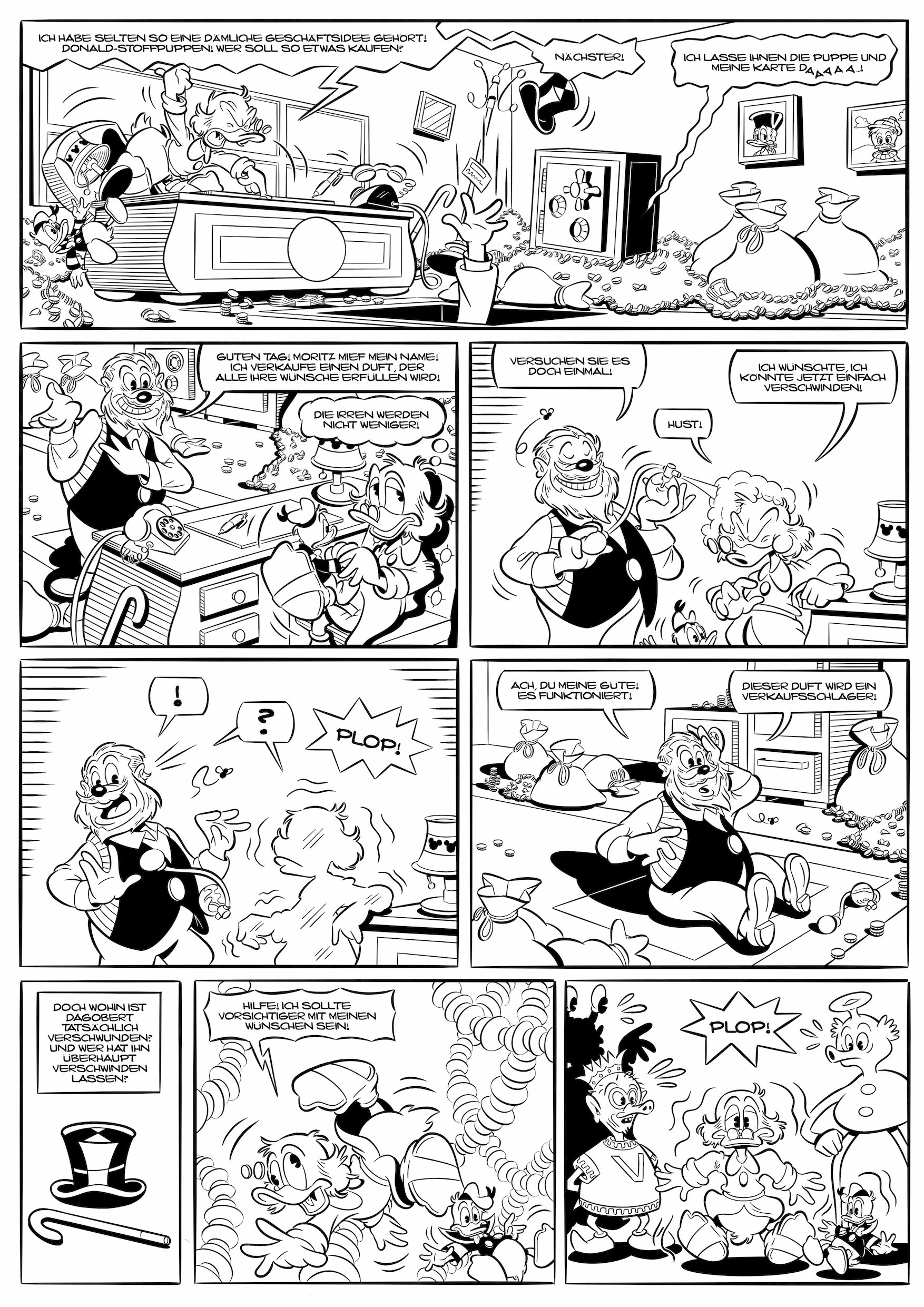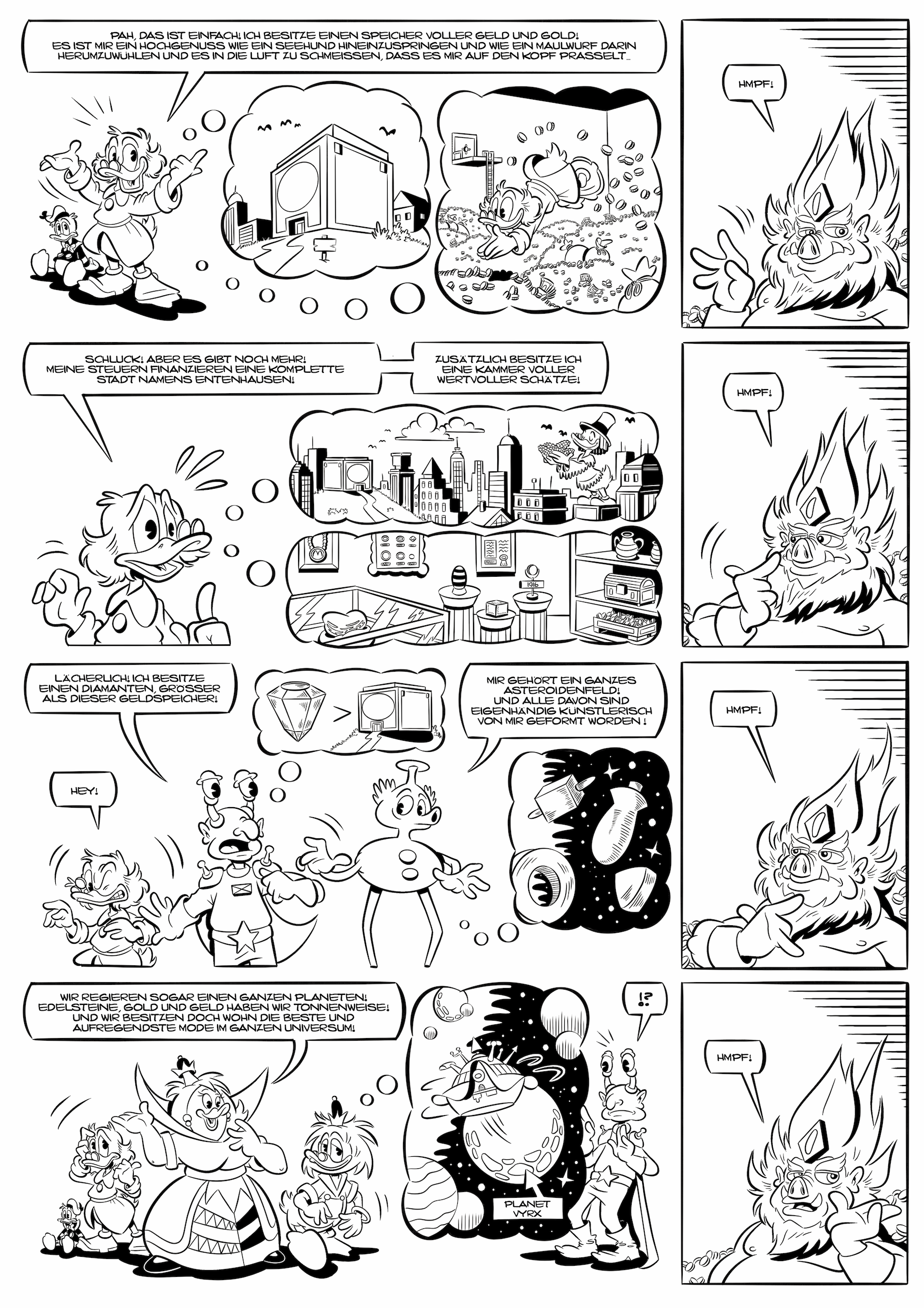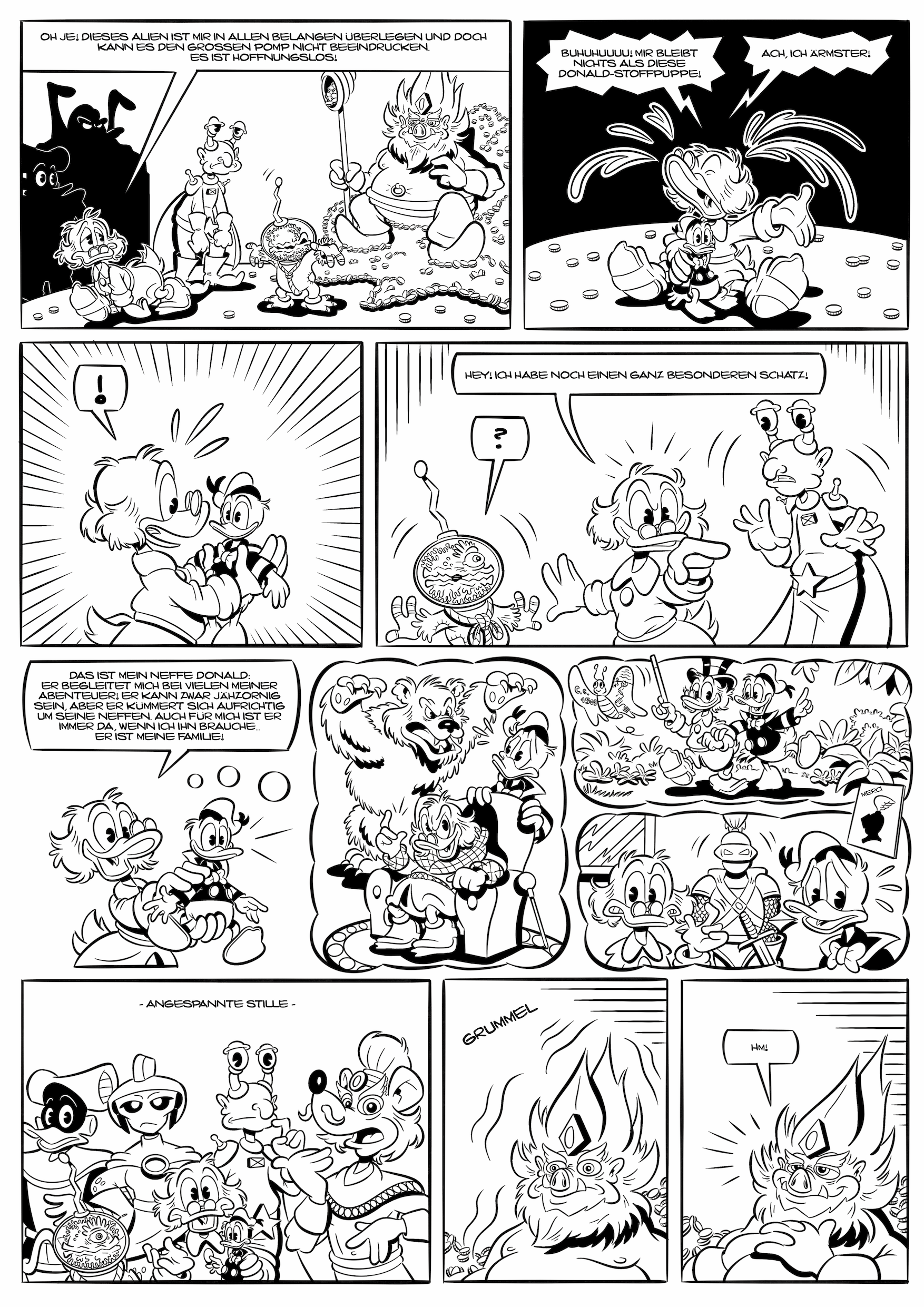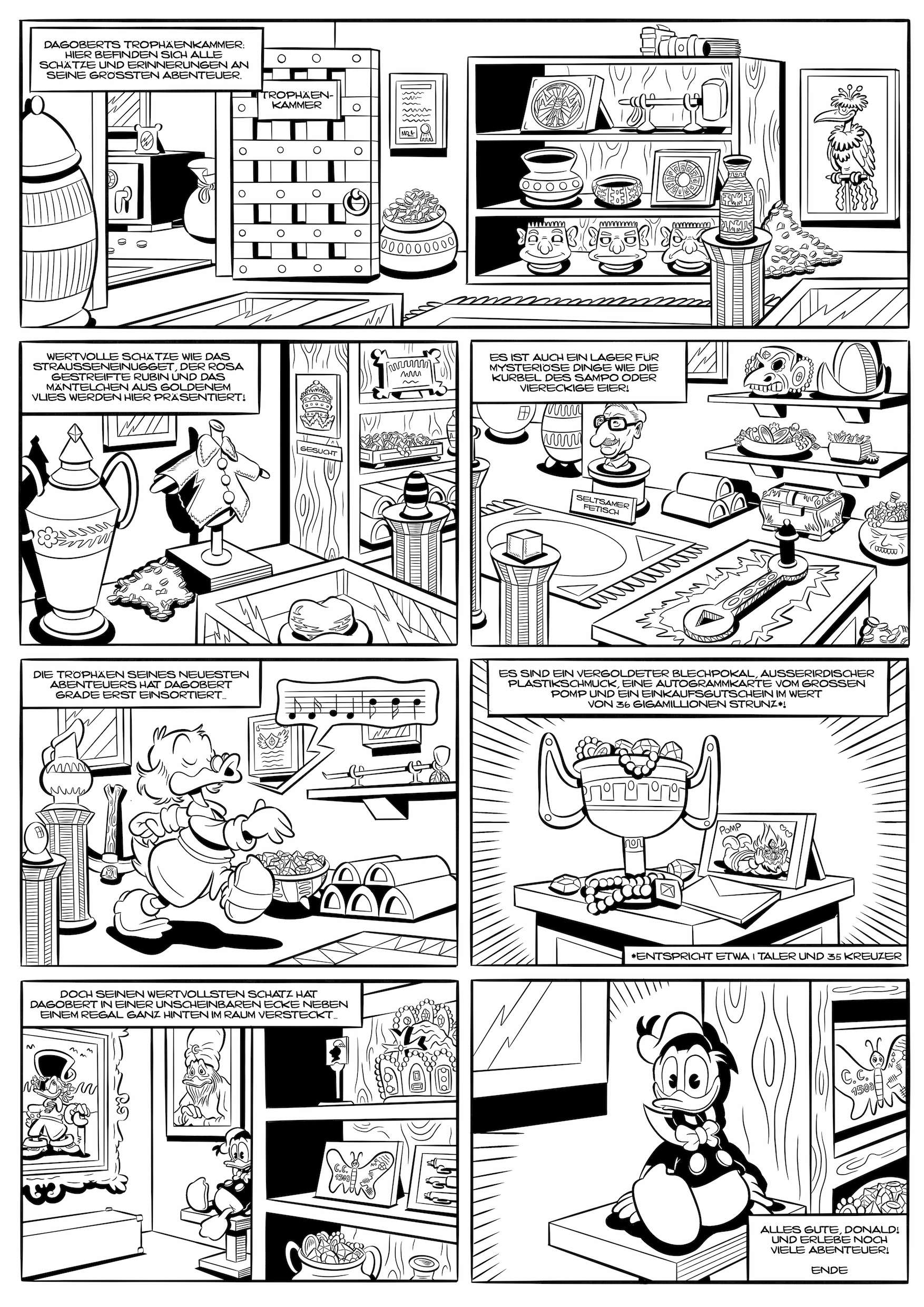 Hintergrund: Diese Geschichte wurde gleichzeitig mit „Das Ungeheuer im Geldspeicher“ als ein alternativer Achtseiter entwickelt. Gezeichnet habe ich sie dann aus Spaß an der Freude. Zusätzlich wollte ich meinen Stil weiterentwickeln. Es ist eine Dagobert-Story zum 90sten Geburtstag von Donald. Darauf muss man erstmal kommen! Ich habe viele Referenzen an bekannte Geschichten eingebaut. Neben den obligatorischen Anspielungen an Carl Barks und Don Rosa verweise ich auch auf ein paar große italienische Geschichten (Ducklas MacDuck!). Es sind wieder nur acht Seiten, daher liegt auch hier der Fokus auf eine simple Botschaft. Happy Birthday, Donald!