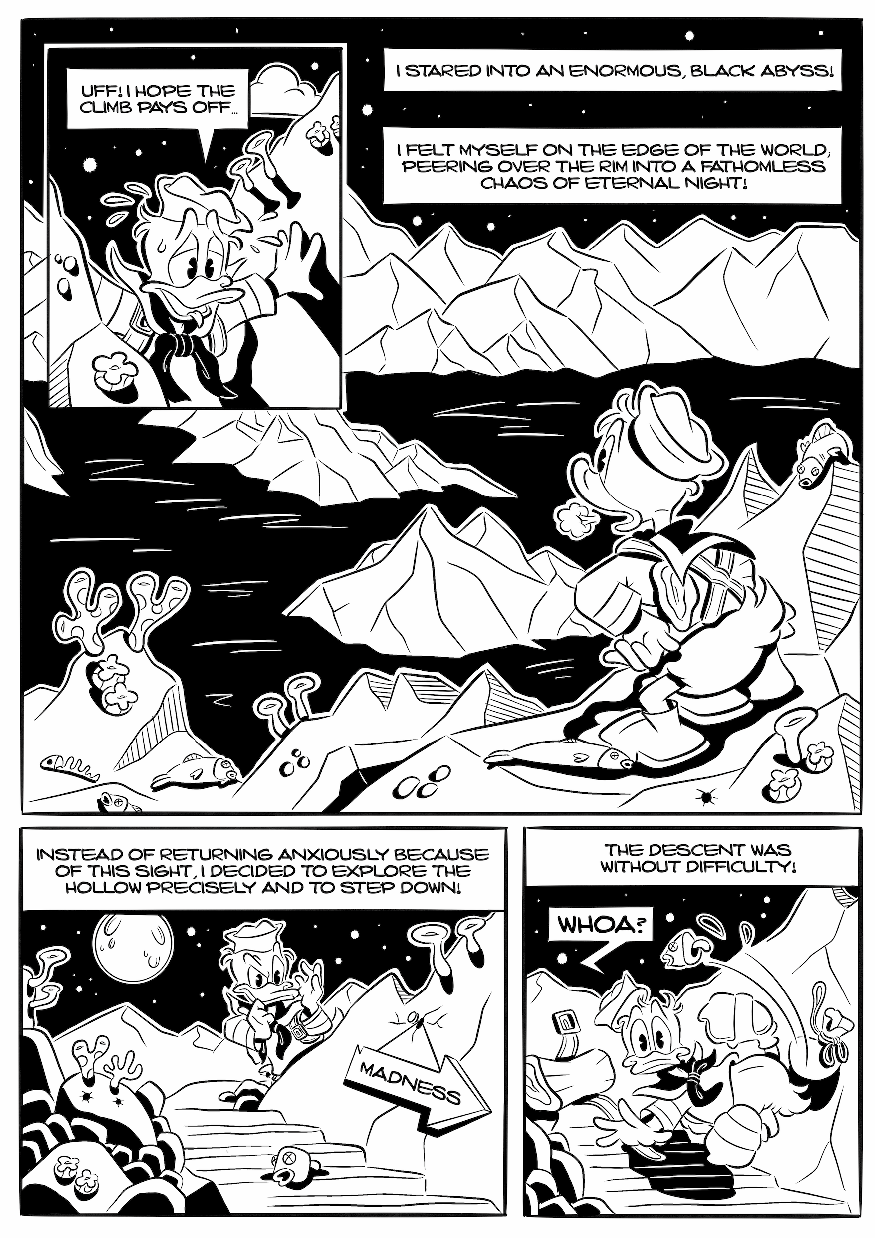 Background: Much of Lovecraft’s early story is beautifully vaguely described, so that some sentences could be completely taken over in a Disney comic. So the gag is to combine Lovecraft’s original text with Disney drawings. Who says the monolith described by Lovecraft doesn’t look like a money bin?